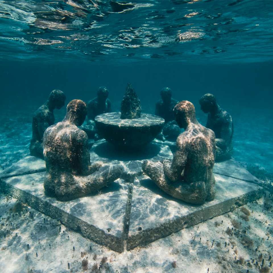 Share the vision of sculptor Jason deCaires Taylor and marine biologists to create a unique underwater environment that combines art with coral reef conservation. Discuss how the sculptures are designed to promote marine life growth.